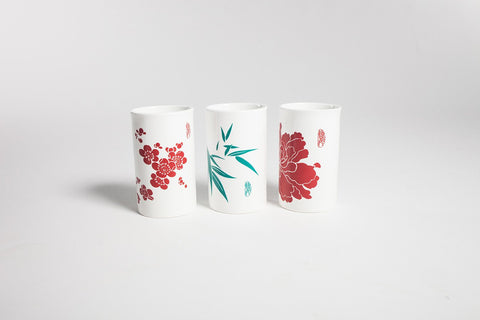 It's like taking a walk through a wonderfully lush garden with these beautifully hand-painted porcelain drinking cups, each designed in its own unique peony, bamboo and plum flower design.